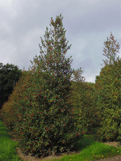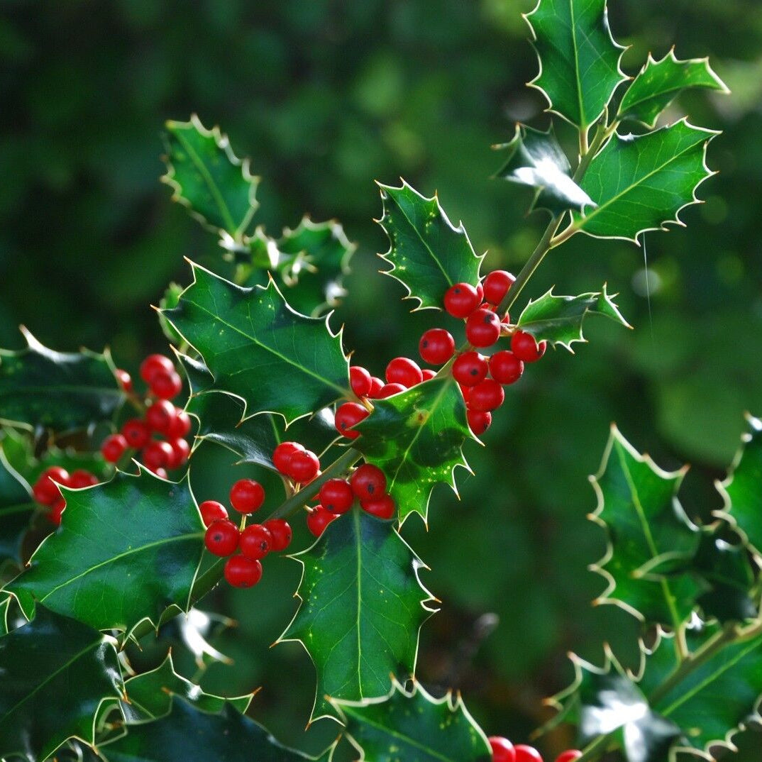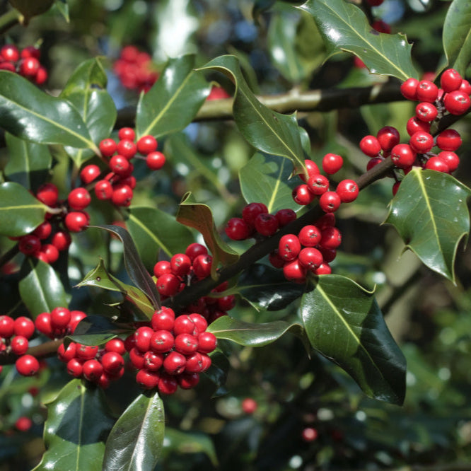 A popular choice for the winter garden and all year around interest. Also known as English Holly or Common Holly. Can grow up to 12 meters high and 8 meters wide. Holly Ilex produces dark green spiked leaves with small white flowers in spring and summer followed by red berries in Autumn and Winter. Will attract birds. Cut branches can be used as part of a Christmas display in the home. Please note the leaves have sharp edges and the berries are toxic to humans, cats and dogs.