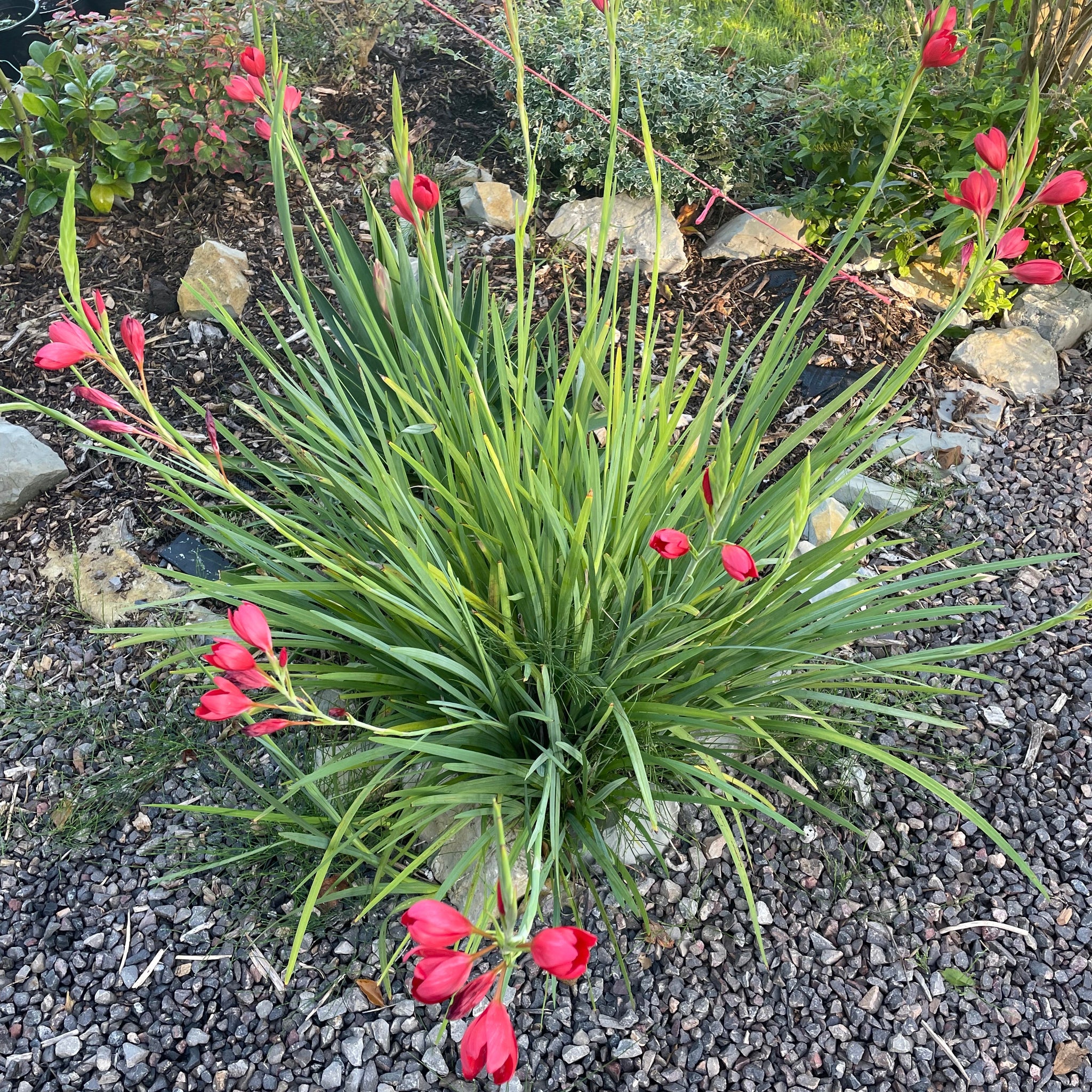 Also known as Crimson Flag, grown as an ornamental flowering plant. Native to South Africa and Zimbabwe it is a semi evergreen herbaceous perennial growing up to 60 cm tall with bright pink red simple flowers. Flowering from late summer to Autumn. Hesperanthera Coccinea is part of the Iris family. Dead head to prolong flowers and cut back stems once they have faded. Water well. Please note this plant is toxic to pets. propagate by division. Grows up to 60 cm tall. Hesperanthera Coccinea has received The Royal Horticulture Society Gold Merit Award meaning it is a reliable plant.